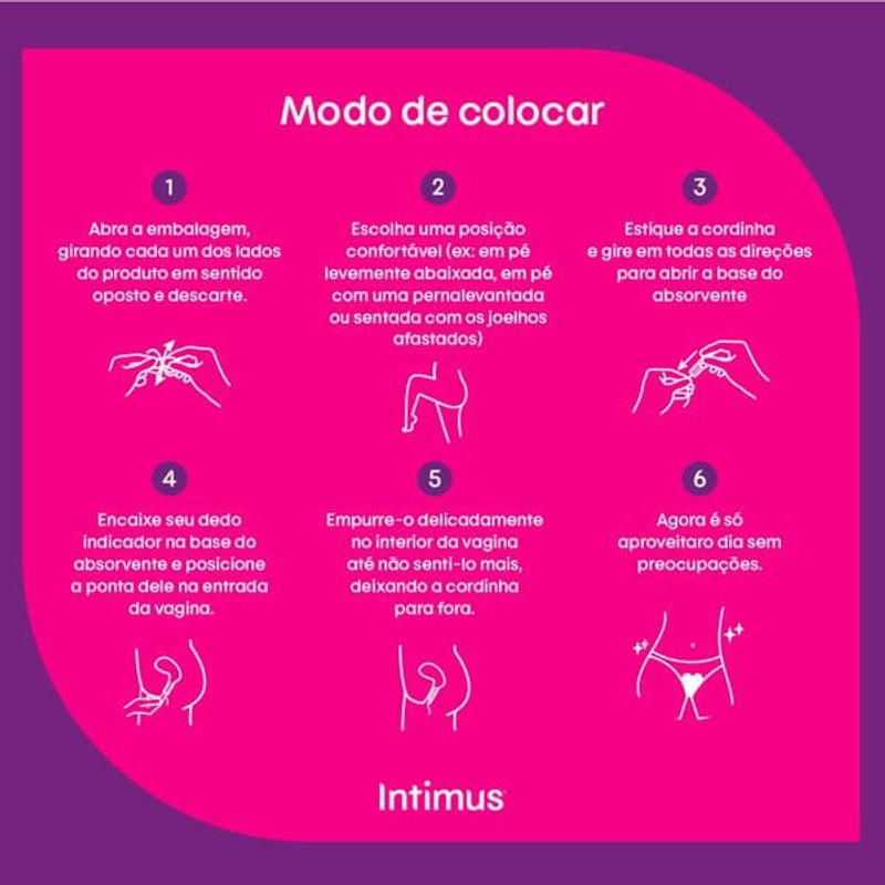 Encontre uma posição confortável, como sentada ou em pé com uma perna apoiada em um objeto elevado. Segure o absorvente entre o polegar e o indicador, inserindo-o delicadamente na entrada da vagina. Empurre-o na direção do canal vaginal, mantendo-o inclinado em um ângulo de 45 graus em direção ao osso púbico. Você pode usar um espelho para ajudar na inserção, se necessário. Empurre o absorvente até que ele esteja totalmente dentro da vagina, sem sentir desconforto. Certifique-se de que o cordão do absorvente esteja fora da vagina, pois ele será usado para remover o absorvente posteriormente. Uma vez inserido, você não deve sentir o absorvente se estiver posicionado corretamente. Se sentir desconforto, remova e tente novamente com um novo absorvente. Lembre-se de trocar o absorvente a cada 4 a 8 horas, conforme necessário, e sempre lave as mãos antes e depois de inserir o absorvente.