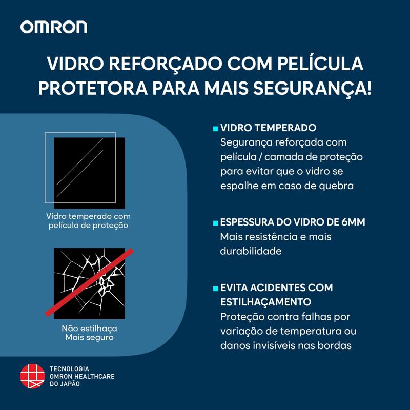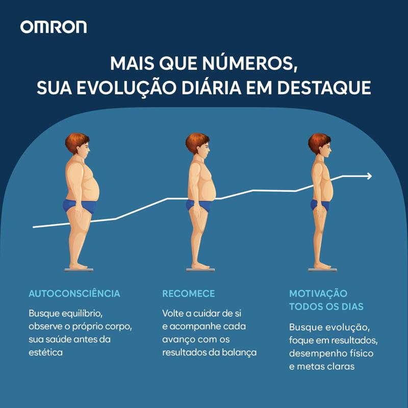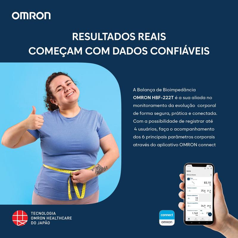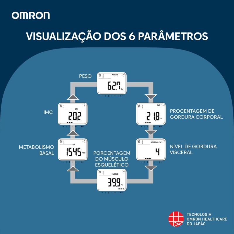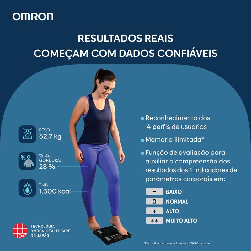 Mede peso corporal, percentual de gordura corporal, gordura visceral, músculos esqueléticos, metabolismo basal e índice de massa corporal (IMC). Tecnologia Bluetooth para sincronização com o aplicativo OMRON Connect. Reconhecimento automático de até 4 perfis de usuário. Função de avaliação que interpreta os resultados em quatro indicadores: baixo, normal, alto e muito alto.