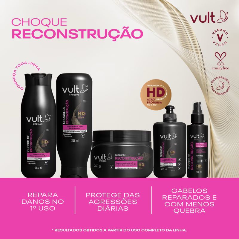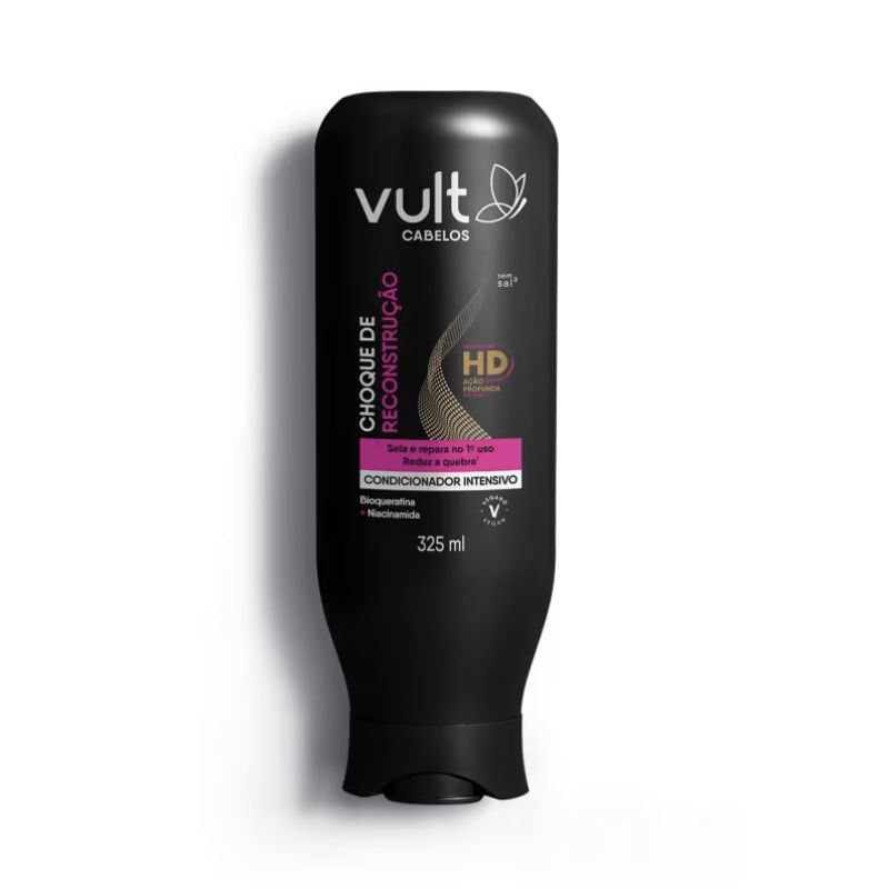 O Condicionador Intensivo Vult Choque de Reconstrução condiciona profundamente enquanto sela a cutícula capilar, deixando-os alinhados e sem frizz. Sua fórmula com Bioqueratina + Niacinamida fortalece, reduz a quebra e o ressecamento dos fios.