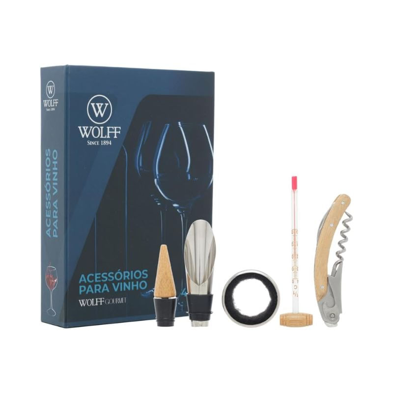 Conjunto 4 Peças de Aço Inox Detalhe Estilo Madeira para Vinho com Caixa Wolff