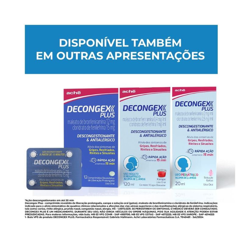 Decongex Plus Maleato de Bronfeniramina 12mg + Cloridrato Fenilefrina 15mg 4 comprimidos Aché