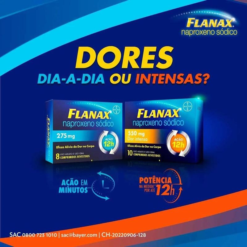 Flanax é indicado para: dores agudas causadas por inflamação como por exemplo, dor de garganta; dor e febre em adultos, como por exemplo dor de dente, dor abdominal e pélvica, dor de cabeça, sintomas de gripe e resfriado; dores musculares e articulares, como por exemplo torcicolo, bursite, tendinite, dor nas costas, dor nas pernas, cotovelo do tenista, dor reumática; dor após traumas: entorses, distensões, contusões, lesões leves decorrentes de prática esportiva. v