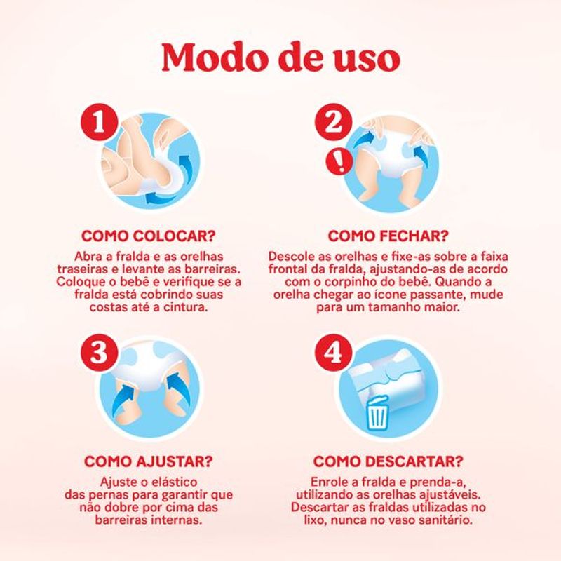 Coloque a fralda passando pelas pernas do bebê e ajuste na cintura. Para remover, abra as abas laterais e descarte após o uso