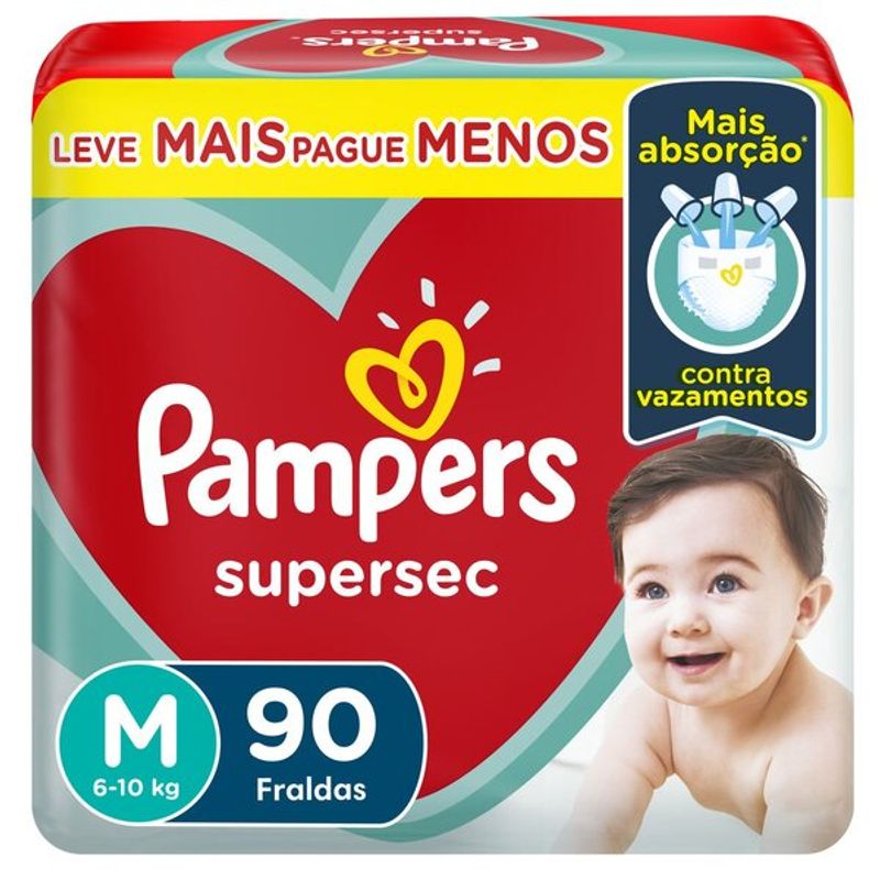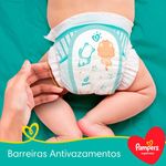 Fralda descartável com barreiras antivazamento e camada extra de absorção para manter a pele do bebê seca por mais tempo.