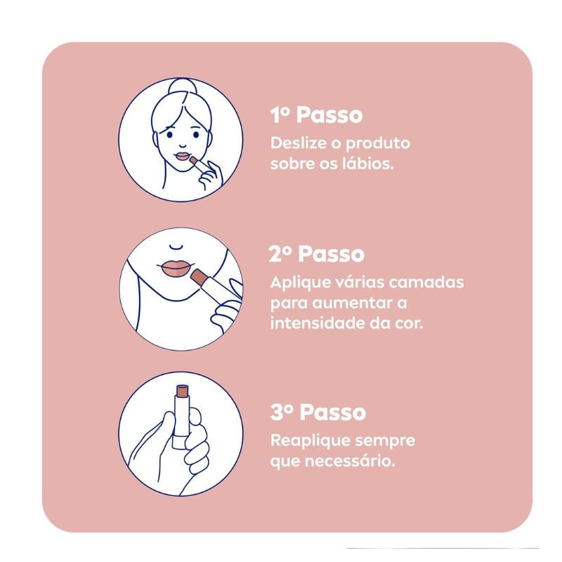 Aplicar diretamente nos lábios sempre que necessário, especialmente em ambientes secos ou antes da exposição ao sol
