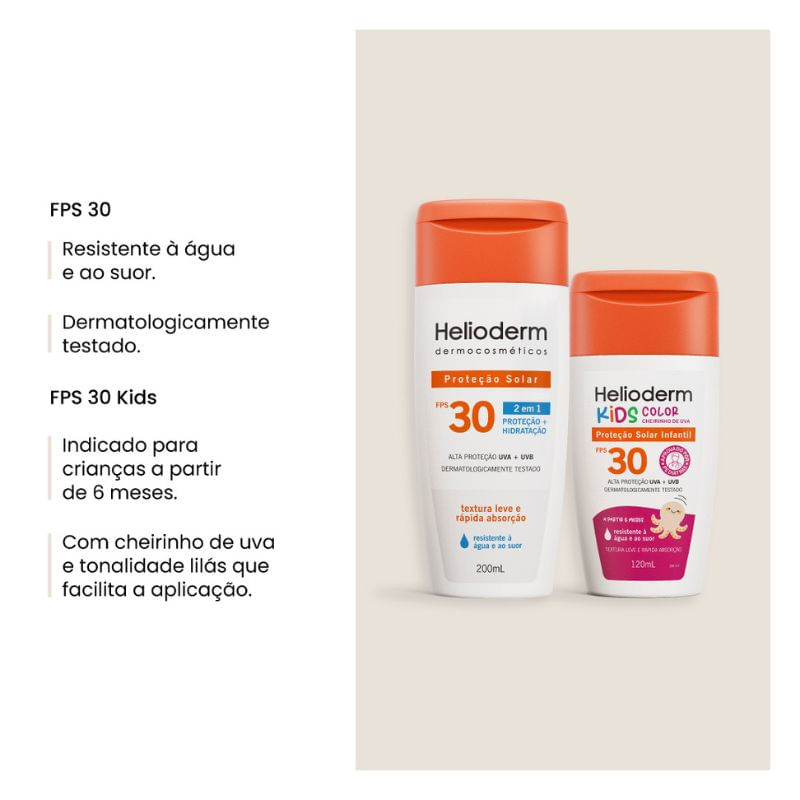 Kit Proteção em Família Helioderm Dercosmético Corporal Adulto FPS30 200mL + Kids Color FPS30 120mL