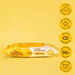 Abra a tampa da embalagem e retire o lenço. Limpe suavemente a pele do bebê. Feche bem a embalagem após o uso para manter a umidade dos lenços