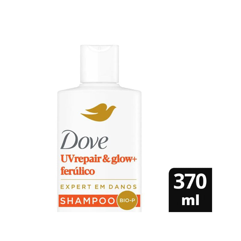 Coloque o Shampoo Dove UV Repair & Glow + Ferúlico nas mãos. Aplique diretamente nos cabelos molhados. Massageie bem a raiz. Enxágue